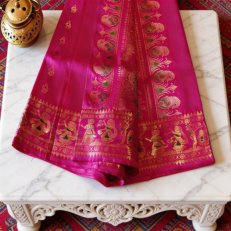 • Design: Rich pallu with narrative or traditional motifs
